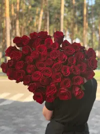 Розкішний букет із насичено-червоних троянд — класичний символ кохання, пристрасті та щирих почуттів. Кожна троянда ретельно відібрана, з оксамитовими пелюстками та глибоким кольором, що підкреслює елегантність композиції. Букет оформлений у стильний білий пакувальний папір і доповнений стрічкою, що робить його ідеальним подарунком для особливих моментів: зізнання в коханні, річниці, дня народження або просто щоб сказати «ти для мене важлива».