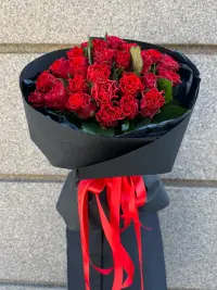 Справжня класика у сучасному виконанні. Насичені червоні троянди зібрані у щільний букет і доповнені контрастним чорним пакуванням. Яскраві стрічки додають святкового акценту, створюючи образ пристрасті та вишуканості.