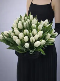 Ніжний моно-букет із білих тюльпанів — втілення чистоти, елегантності та спокою. Акуратні бутони молочно-білого кольору гармонійно поєднуються зі свіжою зеленню, створюючи об’ємну, повітряну композицію.
