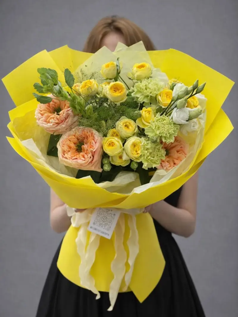 Яскравий авторський букет у сонячному жовтому оформленні — справжній заряд позитиву та тепла. У композиції гармонійно поєднуються ніжні персикові троянди, кремові гвоздики та легкі акценти жовтих квітів і зелені, що створюють свіжий, живий образ.