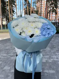 Ніжний букет з блакитних гортензій та хризантем. Ідеальний подарунок для весілля, дня народження чи романтичної події. Замовляйте квіти з доставкою Ірпінь, Ворзель,Буча