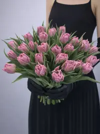 Ніжний піоновидний тюльпан лавандового відтінку вражає своїми пишними, багатошаровими пелюстками та витонченим пастельним кольором. Його об’ємний бутон нагадує півонію, додаючи композиціям розкоші та романтичного настрою.