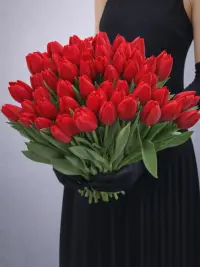 Ефектний моно-букет із яскраво-червоних тюльпанів — символ пристрасті, впевненості та щирих емоцій. Соковиті бутони з насиченим кольором і свіжою зеленню створюють стильну, лаконічну композицію без зайвих деталей.
