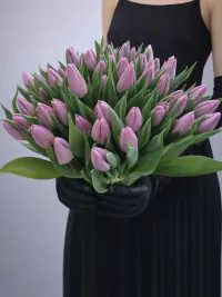 Витончений моно-букет із рожево-лілових тюльпанів — символ ніжності, турботи та теплих емоцій. Акуратні, щільні бутони з м’яким пастельним відтінком у поєднанні зі свіжою зеленою листвою створюють гармонійну, об’ємну композицію.