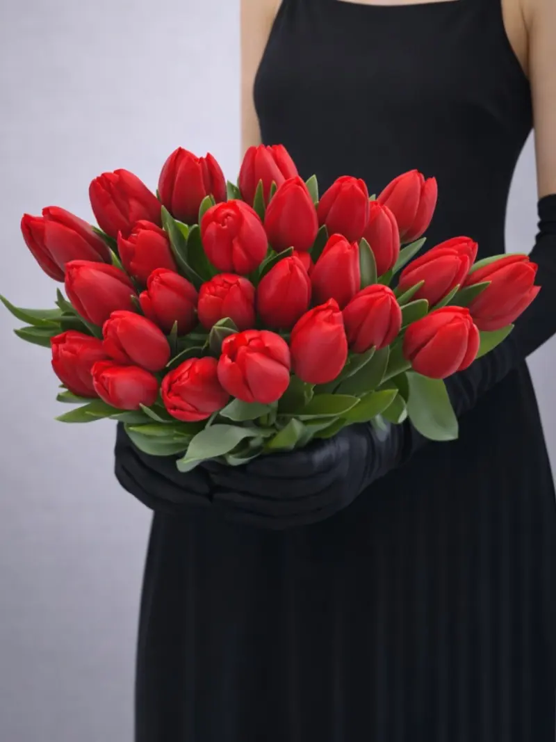 Ефектний моно-букет із яскраво-червоних тюльпанів — символ пристрасті, впевненості та щирих емоцій. Соковиті бутони з насиченим кольором і свіжою зеленню створюють стильну, лаконічну композицію без зайвих деталей.
