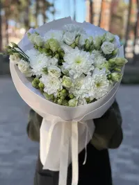Елегантний та ніжний букет у витонченій біло-зеленій гамі, який зачаровує своєю легкістю та гармонією. Композиція поєднує пишні білі хризантеми та ніжні кущові троянди, створюючи об’ємний і водночас повітряний вигляд. Кожна квітка додає букету природної краси та витонченості.