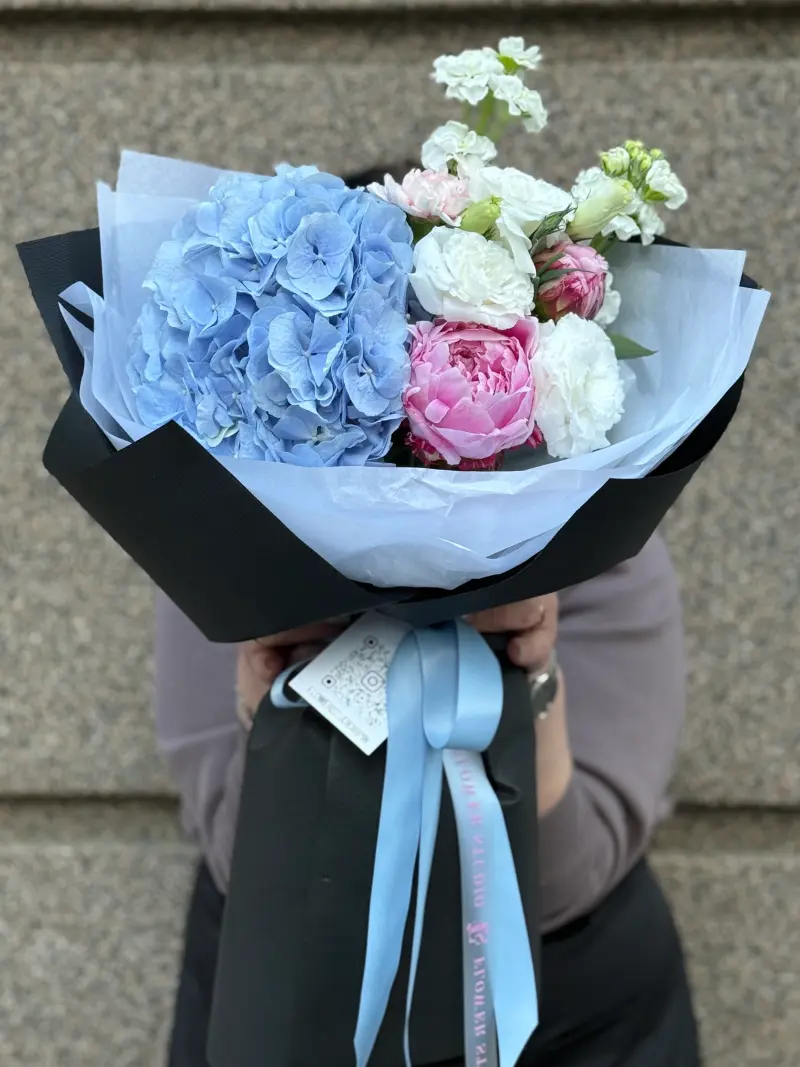 Стильний мікс ніжних пастельних відтінків і трендового контрасту. Акцентна блакитна гортензія поєднана з рожевою півонією, білим діантусом, лаймовою еустомою та ароматною матіолою. Чорне преміум‑пакування робить кольори яскравішими, а блакитна стрічка додає елегантності. Букет готовий дивувати на дні народження, пропозиції чи фотосесії. Доставимо по Ірпеню, Бучі, Ворзелю день‑у‑день, листівка з вашим текстом — у подарунок.