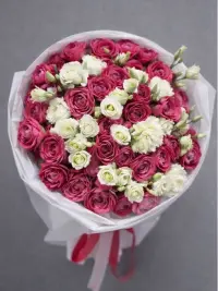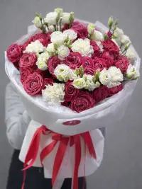 Ніжне поєднання малинових ранункулюсів та витончених білих еустом створює гармонійний, стильний і дуже «живий» букет. Глибокий ягідний відтінок квітів додає композиції характеру, а повітряні світлі акценти — легкості та романтики.
