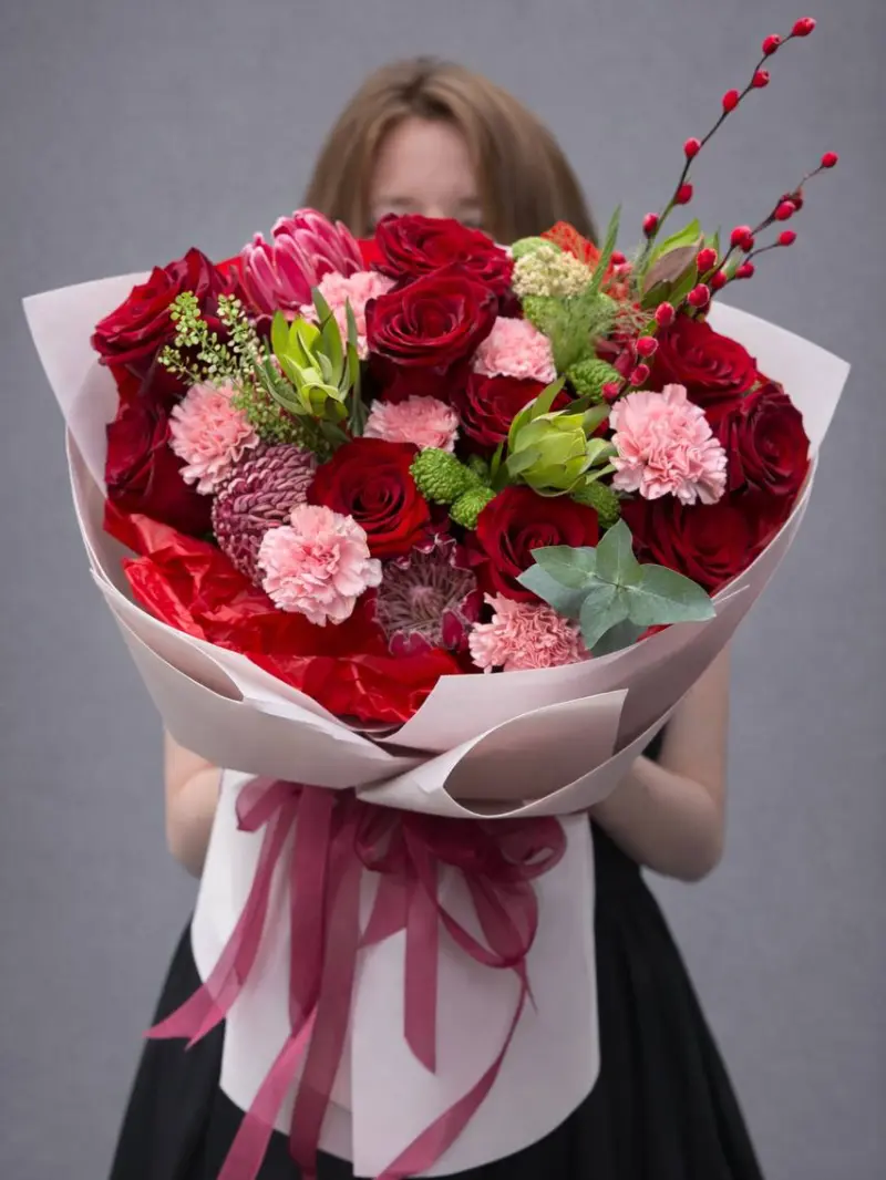 Ефектний букет у глибоких червоних відтінках, який говорить про почуття без зайвих слів. Насичені троянди у поєднанні з ніжними рожевими акцентами та фактурною зеленню створюють стильну, сучасну композицію з характером.