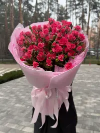 Ніжний букет із 15 гілок спрей‑троянд рожевого відтінку. Багато дрібних бутонів створюють повітряний, об’ємний вигляд. Композиція зібрана в кремове преміум‑пакування та перев’язана білими атласними стрічками. Ідеальний подарунок для зізнання, дня народження, подяки або виписки з пологового. Додаємо листівку з вашим текстом, можемо доповнити кульками чи коробкою солодощів. Доставка по Ірпеню, Бучі, Ворзелю день‑у‑день.