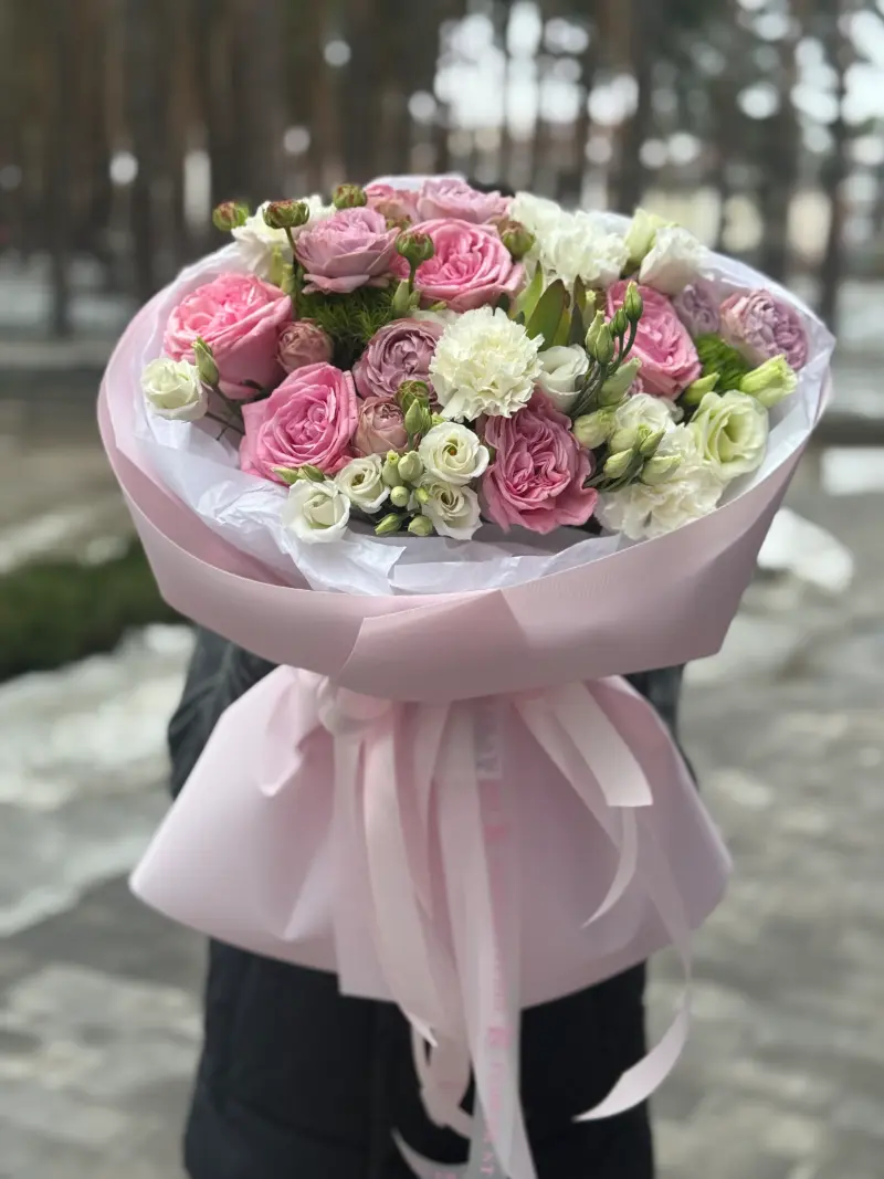 Ніжна, витончена композиція у романтичній рожево-молочній гамі. У букеті гармонійно поєднані півонієподібні троянди, кущові троянди, біла гвоздика та еустома. Кожна квітка розкривається об’ємно та фактурно, створюючи ефект легкості й водночас розкоші.