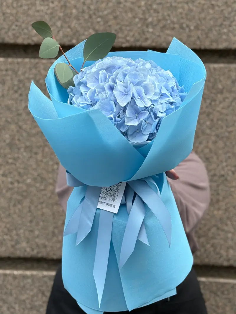 Лаконічний, але дуже фотогенічний букет із однієї великої блакитної гортензії. Об’ємна «шапка» ніжного небесного відтінку, акцентна гілочка евкаліпта і трендове бірюзове пакування зі стрічками — ідеальне рішення для подяки, тендітного привітання чи тематичної фотосесії. Доставка по Ірпеню, Бучі, Ворзелю у день замовлення, листівка з вашим текстом — безкоштовно.