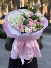 Вишуканий букет, який поєднує ніжність, легкість та елегантність. Композиція створена з повітряної білої гортензії, витончених ранункулюсів, ніжних рожевих тюльпанів, кущових троянд та декоративної зелені. Квіти гармонійно доповнюють один одного, створюючи романтичний та дуже ніжний образ.