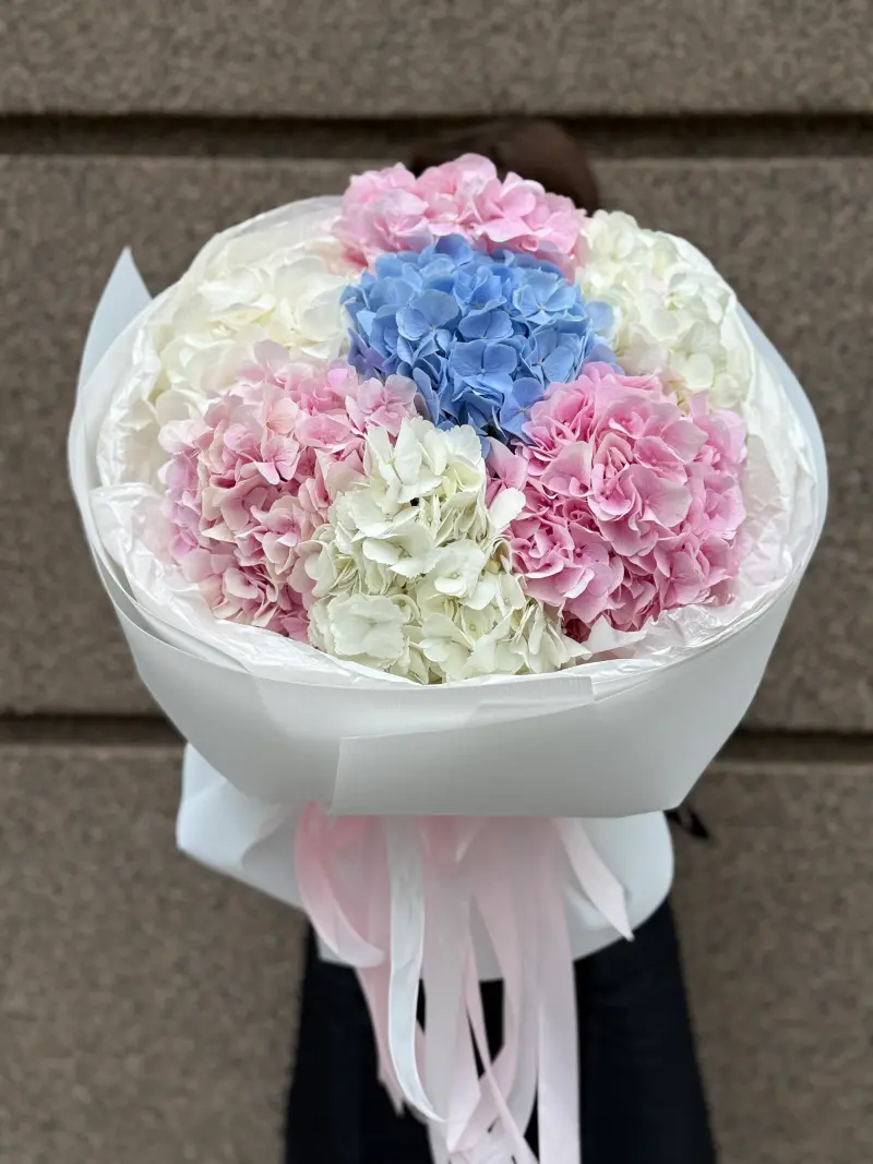 Неймовірно ніжний та об’ємний букет, складений із семи гортензій у трьох відтінках: небесно-блакитному, чисто-білому та ніжно-рожевому. Поєднання кольорів створює гармонійну композицію, що символізує щирість, любов і гармонію.