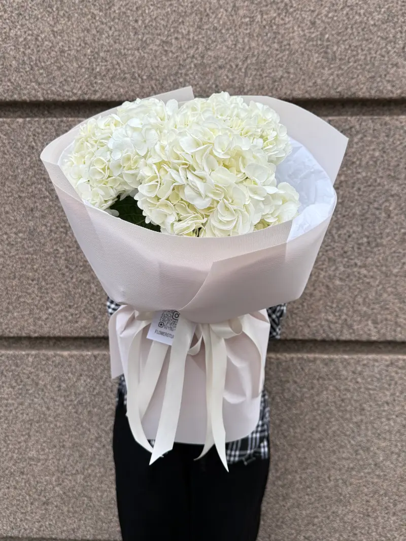 Вишуканий букет із трьох білих гортензій — символ ніжності, чистоти та гармонії. Великі повітряні суцвіття створюють відчуття легкості й святковості. Такий букет стане ідеальним вибором для весілля, ювілею чи як витончений подарунок для особливої людини.