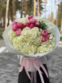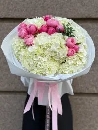 Вишуканий букет, який поєднує елегантність білої гортензії та ніжність рожевих півоній. Об’ємні суцвіття гортензії створюють повітряну основу, а насичені рожеві півонії додають яскравих акцентів і романтичного настрою. Ідеальний вибір для визнання в коханні, ювілею чи просто щоб подарувати гарний настрій.