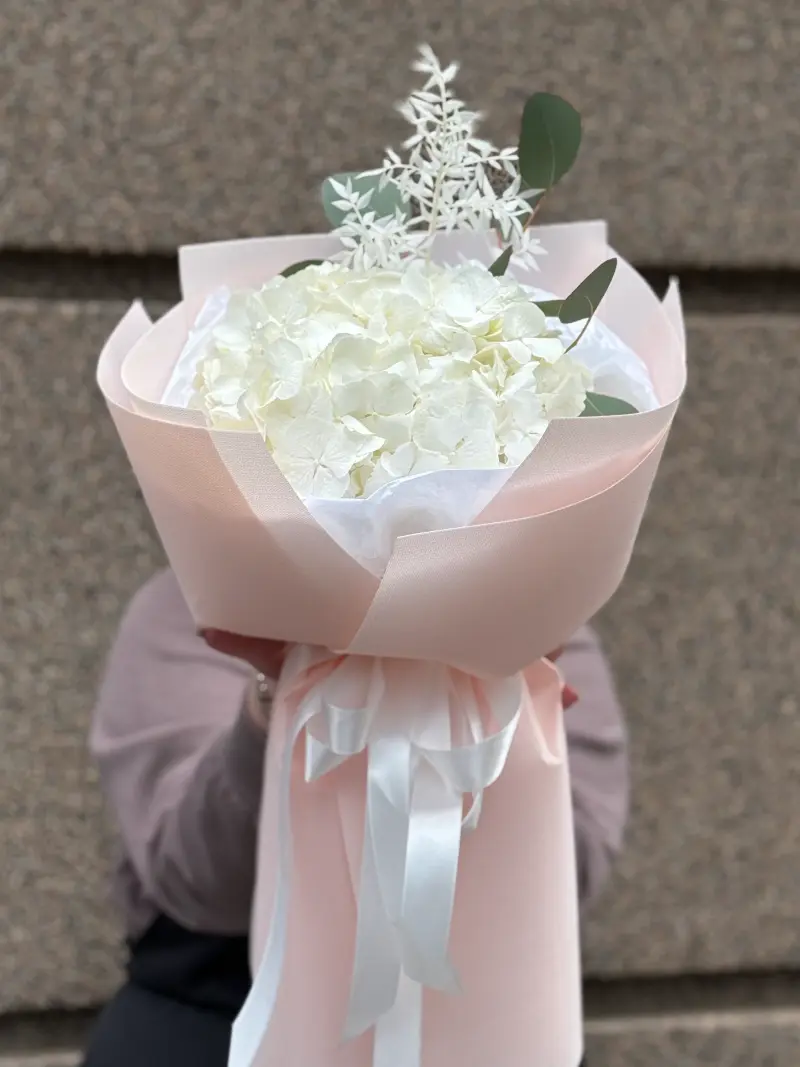 Лаконічний букет з однієї великої айворі гортензії. Свіжу шапку доповнюють гілочки евкаліпта та витончений відбілений рускус. Все загорнуто у ніжно‑нюдове преміум‑пакування й перев’язано шовковими білими стрічками — ідеальний комплімент на виписку, хрестини, подяку чи трендову фотосесію. Швидка доставка по Ірпеню, Бучі, Ворзелю, листівка з вашим текстом — безкоштовно.