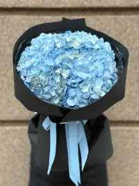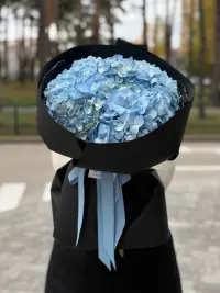 Ніжний та витончений букет із розкішних суцвіть блакитної гортензії — символ щирості, спокою та гармонії. Оформлений у стильну чорну упаковку та перев’язаний стрічкою в тон квітів, він виглядає сучасно та елегантно.
