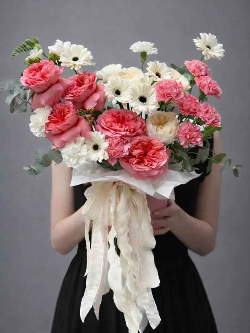 Витончений букет у ніжній коралово-кремовій гамі, що поєднує елегантність і легкість. Пишні садові троянди гармонійно доповнюються повітряними герберами та ніжними гвоздиками, створюючи живу, динамічну композицію.