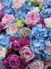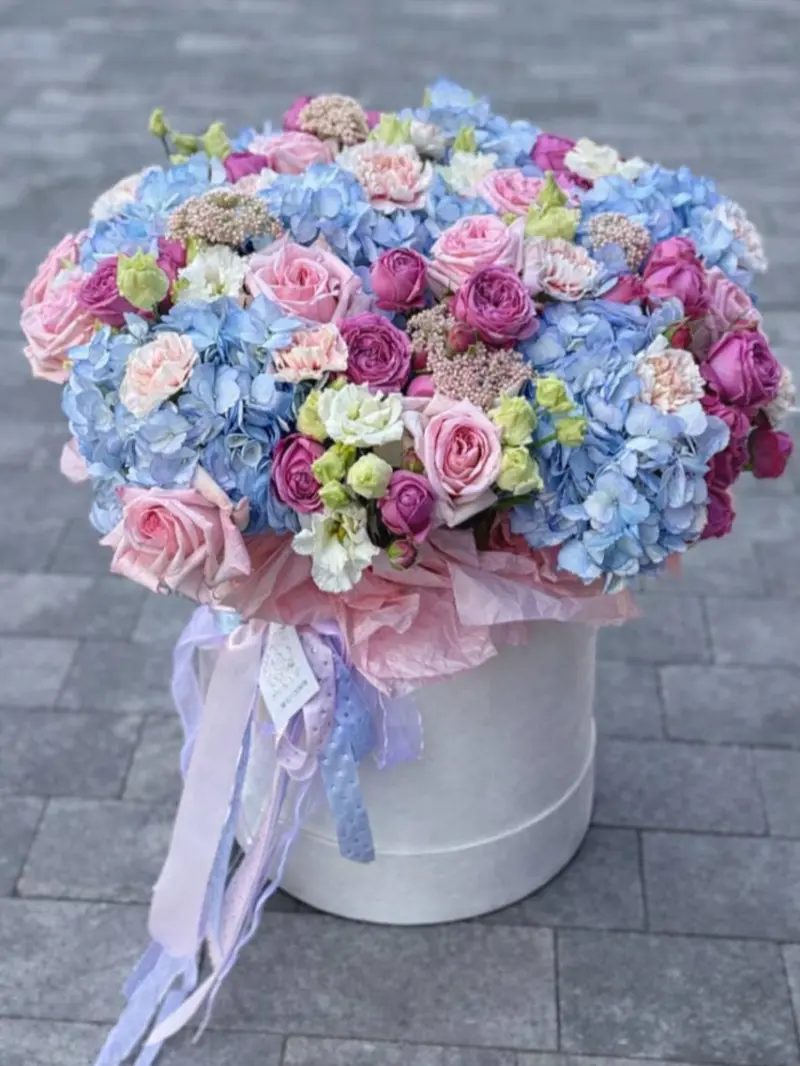 Ніжна та об’ємна композиція, що зачаровує своєю повітряністю та витонченим поєднанням кольорів. Гармонія блакитних гортензій, пудрових троянд і яскравих акцентів створює ефект справжньої квіткової хмари.