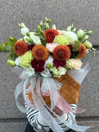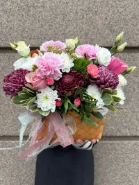 Ніжна композиція у плетеному кошику, створена з поєднання троянд, еустоми, хризантем та сезонних квітів у відтінках білого, рожевого, бордо й зеленого.