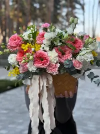 Витончена квіткова композиція в ніжних відтінках рожевого та білого — ідеальний вибір для особливих моментів. Пишні садові троянди гармонійно поєднуються з делікатними еустомами та легкими акцентами жовтих польових квітів, створюючи відчуття свіжості, тепла та природної краси.