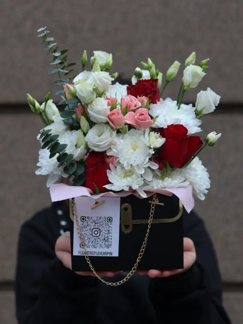 Елегантна квіткова композиція в стильній чорній коробці з золотою ручкою. Поєднання червоних та ніжно-рожевих троянд, білосніжних хризантем, еустоми та зелені створює гармонійний та святковий образ. Ідеальний подарунок для особливих подій: дня народження, річниці, весілля чи просто для вираження уваги та турботи.