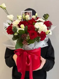 Вишукана квіткова композиція в червоній оксамитовій коробці з біло-червоним наповненням – це ідеальний подарунок для особливих моментів. Поєднання насичених червоних та ніжних білих квітів створює контрастну й водночас гармонійну композицію, яка символізує кохання, щирість та повагу.