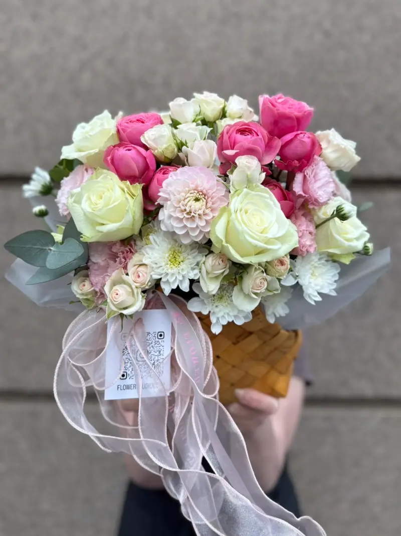 Витончена композиція в плетеному кошику у пастельних відтінках. Поєднання білих і кремових троянд, рожевих піоновидних троянд, жоржини, спреєвих троянд, ніжних хризантем та акцентів евкаліпта. Легкі повітряні стрічки додають святковості. Ідеально для дня народження, подяки, виписки з пологового, хрестин чи романтичного привітання. Дбайливо зберемо та доставимо по Ірпеню, Бучі, Ворзелю.