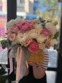 Витончена композиція в плетеному кошику у пудрово‑рожевій гамі. Поєднання піоновидних троянд, спрей‑троянд, білих діантусів, помпонних хризантем і легкого евкаліпта створює м’який, дуже «фото‑френдлі» образ. Кошик не потребує вази — зручно дарувати вдома чи в офісі. Акуратно пакуємо й доставляємо по Ірпеню, Бучі, Ворзелю.