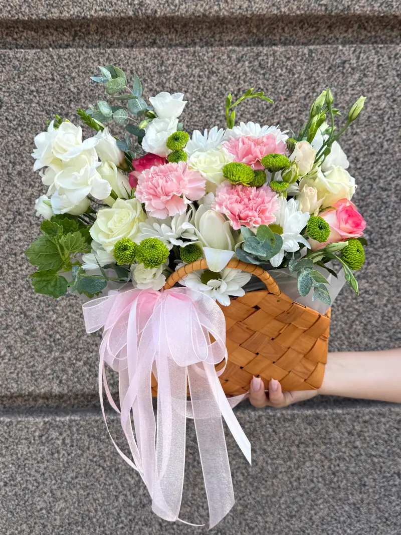 Такий кошик з квітами стане чудовим подарунком на день народження, ювілей, весілля чи будь-яку іншу важливу подію. Поєднання ніжних відтінків символізує турботу, щирість і теплі почуття, даруючи атмосферу радості та гармонії.