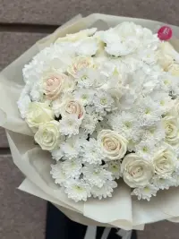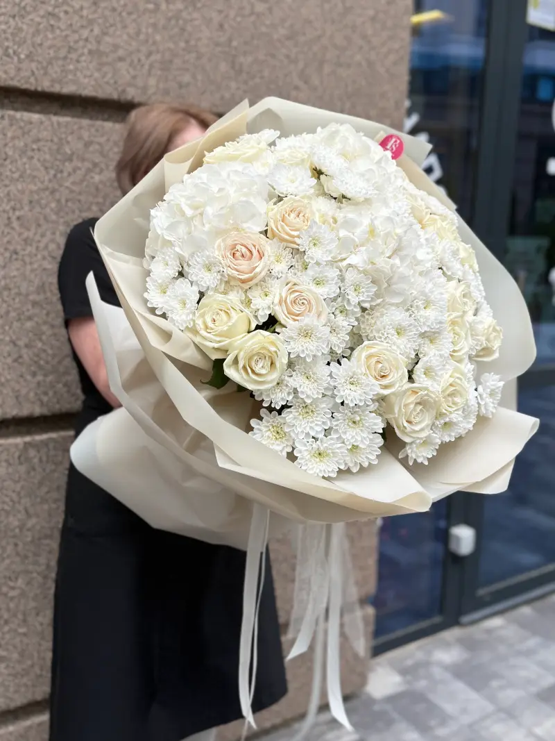 Вишуканий білий букет у монохромі: поєднання троянд айворі, троянд, помпонних хризантем та гортензій