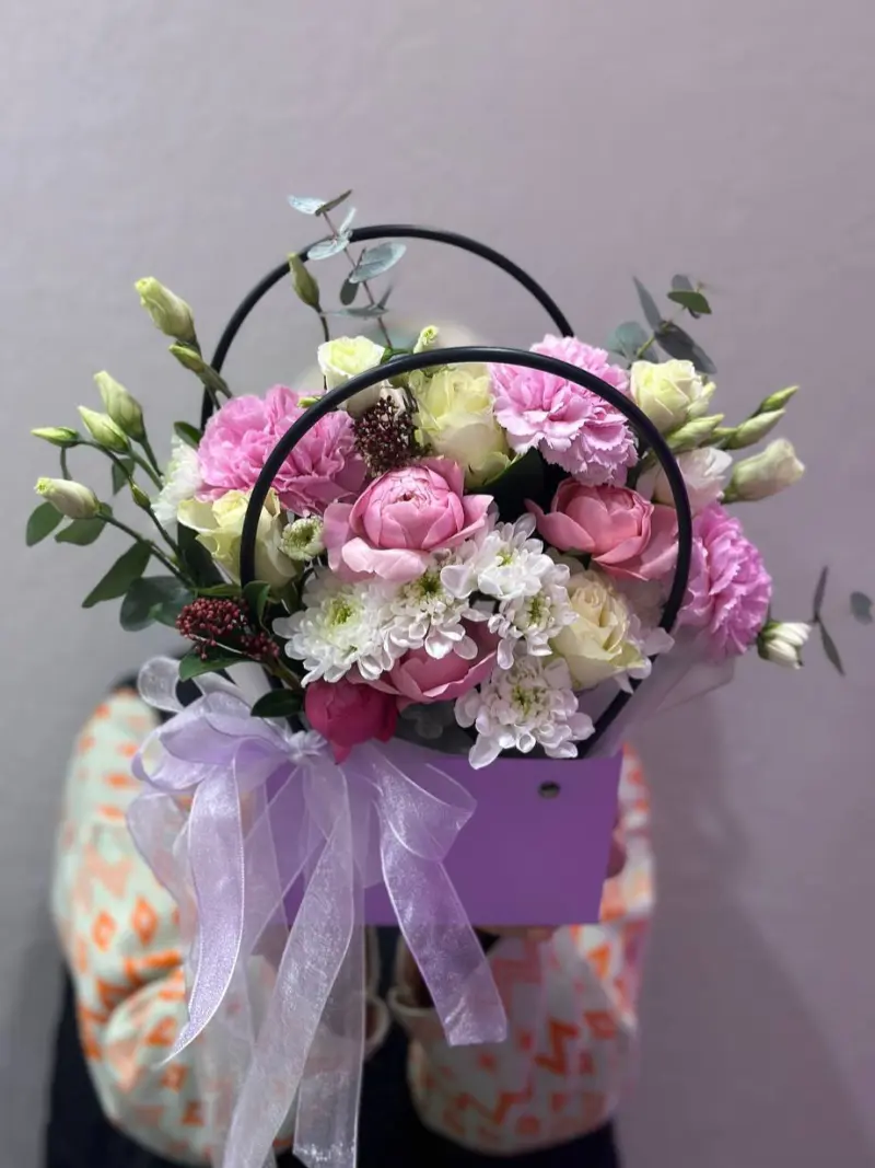 Витончена композиція у стильній коробці з ручками — сучасна альтернатива класичному букету. Поєднання рожевих півоній, ніжних троянд, гвоздик і білих хризантем створює гармонійний, романтичний настрій. Легка зелень додає свіжості, а напівпрозора стрічка підкреслює тендітність та елегантність оформлення.
