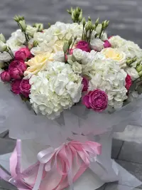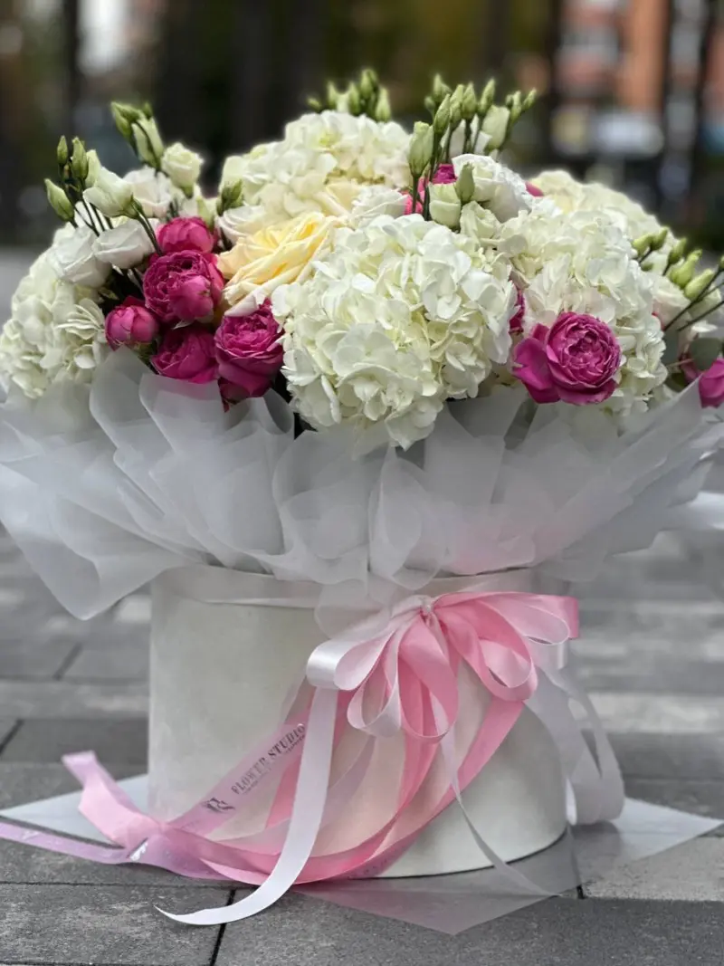 Вишукана композиція, що поєднує білосніжну гортензію, кремові троянди, рожеві півонійні троянди та ніжну еустому.