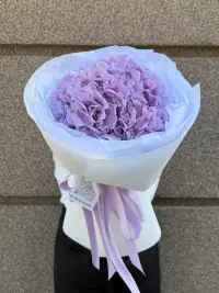 Стильний моно-букет із однією гортензією ніжно-лавандового відтінку. Великі, пишні суцвіття символізують гармонію, витонченість і щирість почуттів. Лаконічне оформлення підкреслює природну красу квітки, роблячи її центральним акцентом композиції.
