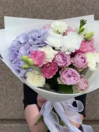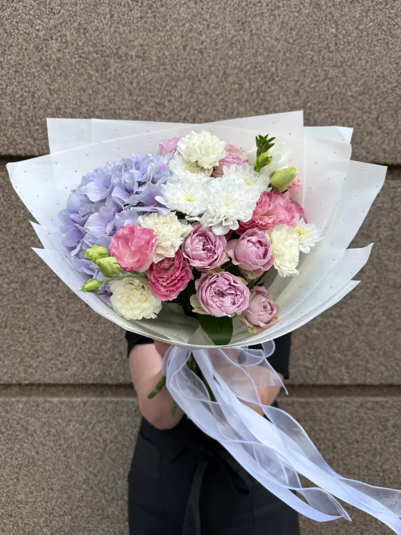 Ніжний букет у білому пакуванні: лавандова гортензія, піоновидні троянди, білі хризантеми, рожеві гвоздики й еустома. Ідеальний подарунок для особливих моментів.