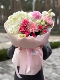 Легкий, повітряний букет у пастельній гамі. Поєднання рожевої гортензії, еустоми, спрей‑троянд , діантуса та білих хризантем з делікатним евкаліптом. Акуратно оформлено у біле пакування з дрібним принтом та рожевою органзою. Ідеальний подарунок для дня народження, подяки, виписки з пологового чи романтичного привітання. Швидка доставка по Ірпеню, Бучі, Ворзелю.