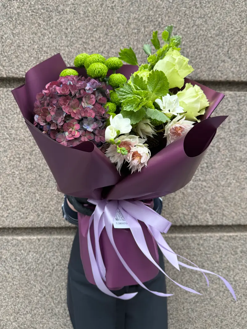 Ніжний, сучасний і свіжий — цей букет створений для тих, хто цінує природну елегантність. Поєднання м’яких відтінків зелені, кремових та рожево-бузкових квітів створює відчуття легкості та спокою. Гортензія додає об’єму, зелені хризантеми — яскравості, а троянди — нотку романтики. Ідеальний варіант для подарунку на день народження, зустріч або просто щоб подарувати гарний настрій.