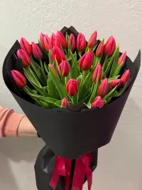 Насичений малиновий колір тюльпанів у поєднанні з елегантним чорним пакуванням створює неповторний контраст і стильний вигляд. Ідеальний подарунок для особливих моментів або як акцент у декорі, який не залишить байдужим.