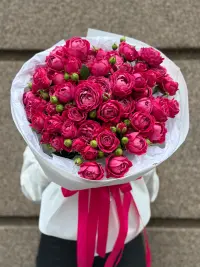 Виразний букет із піоновидних спрей‑троянд насиченого рожевого відтінку. Десятки щільних бутонів створюють об’єм і «вау‑ефект» на фото та наживо. Акуратне біле матове пакування і стрічка підкреслюють контраст і роблять композицію преміальною. Ідеально для дня народження, пропозиції, річниці або коли потрібно вразити з першого погляду. Швидка доставка по Ірпеню, Бучі та Ворзелю.