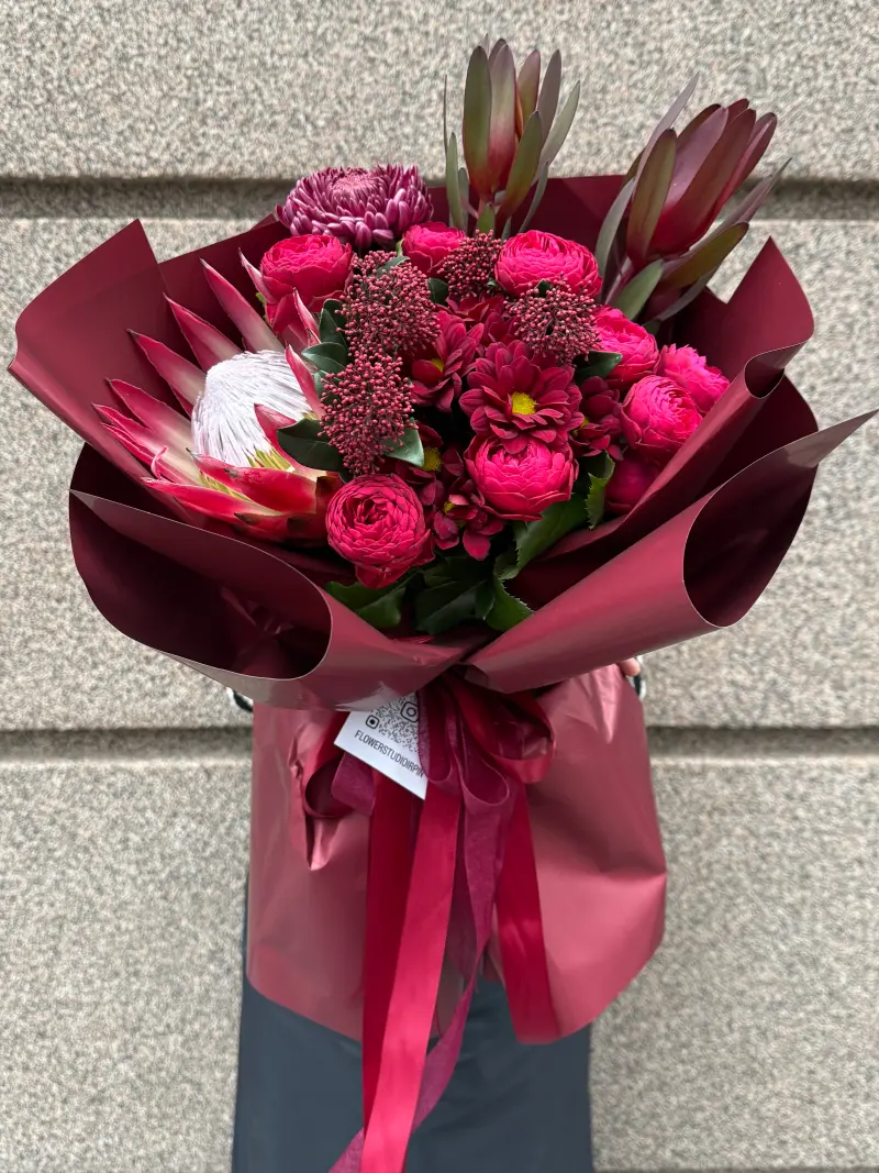 Протея додає композиції оригінальності та яскравого акценту, скім'я створює об'єм і насиченість, а троянди наповнюють букет ніжністю та романтикою. Бордове пакування підкреслює глибину кольорів і робить букет ще більш елегантним.