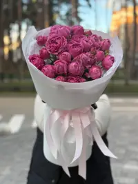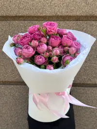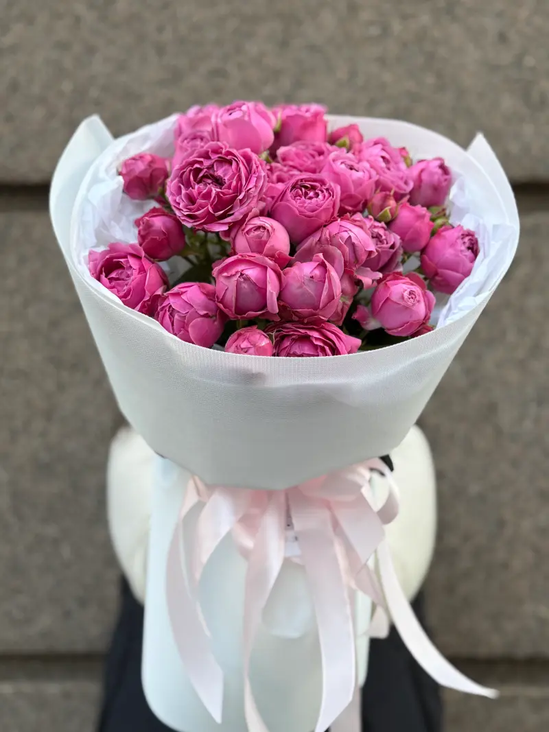 Ніжний та водночас виразний букет із 5 гілочок троянди сорту Misty Bubbles у витонченому білому пакуванні. Цей сорт відомий своїми дрібними квітками насиченого рожево-фіолетового кольору, що розкриваються у гарні суцвіття. Лаконічне біле оформлення підкреслює яскравість бутонів і надає букету вишуканості.