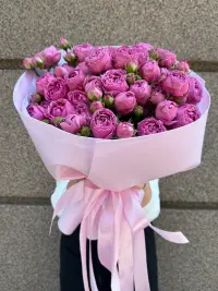 Ніжний та водночас виразний букет із 11 гілочок троянди сорту Misty Bubbles у витонченому рожевому пакуванні. Цей сорт відомий своїми квітками насиченого рожево-фіолетового кольору, що розкриваються у гарні суцвіття. Лаконічне оформлення підкреслює яскравість бутонів і надає букету вишуканості.