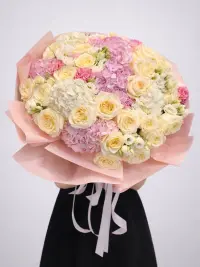 Вишуканий букет у пастельних відтінках, що поєднує кремові троянди та повітряну гортензію у ніжно-рожевих і білих тонах. Гармонійна композиція випромінює легкість, тепло й спокій, створюючи відчуття особливого моменту.