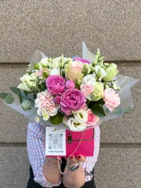 Вишуканий букет у ніжно-рожево-білій гамі з акцентом на яскравих піоновидних трояндах. Композиція поєднує в собі троянди, еустому, гвоздики та свіжу зелень, що додає об’єму та легкості.