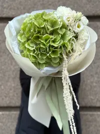 Легкий, витончений та сучасний букет у природних відтінках. Поєднання ніжно-зеленої гортензії, білосніжних еустом і делікатних сухоцвітів створює гармонійну композицію, що випромінює спокій і чистоту. Ідеальний подарунок для цінителів мінімалізму, природної краси та елегантності.