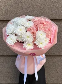 Стриманий і дуже ніжний букет у пастельній гамі. Білі ризантеми поєднані з пудрово-рожевою гортензією, а м’яке рожеве пакування та білі атласні стрічки додають легкості. Влучний подарунок для мами, подруги чи колеги, на день народження, виписку або як подяка.