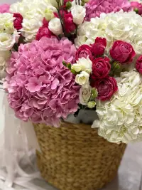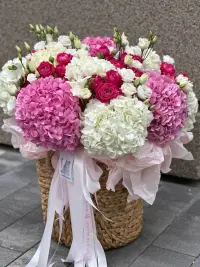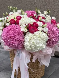 Ніжна квіткова композиція в плетеному кашпо — це втілення витонченості та гармонії. Пишна гортензія створює об’єм і легкість, троянди додають класичної елегантності та аромату, а еустома — нотку ніжності й повітряності. Усе оформлено в натуральне плетене кашпо, що додає теплоти та природного шарму.