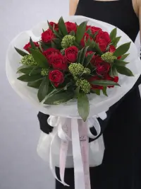 Букет із червоних троянд із декоративною зеленню — класика, що завжди справляє враження. Насичені червоні троянди символізують любов, пристрасть і глибокі почуття, а свіжа зелень додає композиції об’єму та природної гармонії.