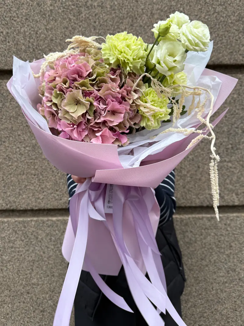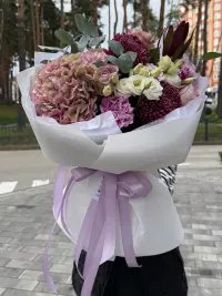 Легкий, витончений та сучасний букет у природних відтінках. Поєднання рожево-зеленої гортензії, білосніжних еустом , зелених діантусів і делікатних сухоцвітів створює гармонійну композицію, що випромінює спокій і чистоту. Ідеальний подарунок для цінителів мінімалізму, природної краси та елегантності.